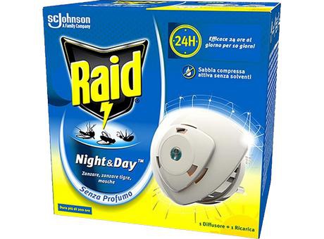 Raid Night & Day è la combinazione di un diffusore elettrico compatto e di una ricarica di sabbia compressa che diffonde in maniera costante il principio attivo senza additivi per 10 giorni. Una luce segnala quando il prodotto è in funzione. Dopo 10 giorni, quando l'indicatore liquido è completamente evaporato, sostituire la ricarica per rinnovare la protezione. |
