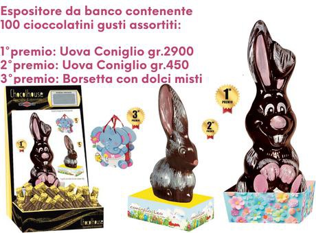 Lotteria Coniglio Rogher Espositore da banco contenente 100 cioccolatini gusti assortiti. 1° premio Coniglio di cioccolato fondente decorato a mano 2900 gr con cestino cestino 2° premio Soggetto di cioccolato al latte decorata a mano 450 gr 3° premio Paperotto con ovetti cioccolato Data di scadenza: 30/01/2028 |