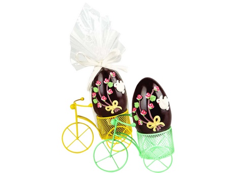 Ovetto di cioccolato fondente decorato posto in una simpatica bici |