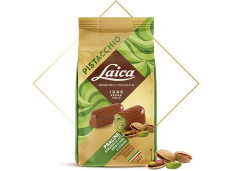 Praline “Fantasy” di cioccolato al latte ripiene di crema al pistacchio.