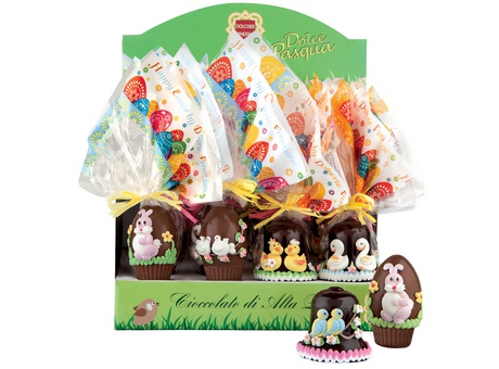 Ovetti e campanelle di finissimo cioccolato al latte e fondente extra di alta qualità decorati in zucchero con coloranti naturali con simpatici gadget assortiti. |